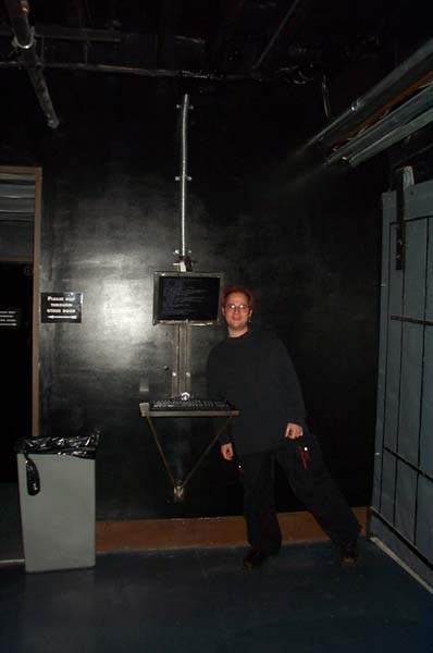 Disassembling a monitor for a kiosk-to-be at the DNA Lounge, taken by Jonathan. July, 2001. | Me with the first kiosk we put together, taken by Jonathan. July, 2001. |