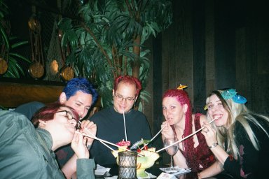 (left to right) Ann, NumaDan, me, Gina, and Charlotte, at the Tonga Room for a big Virgo collective birthday party. September 22, 2001. |