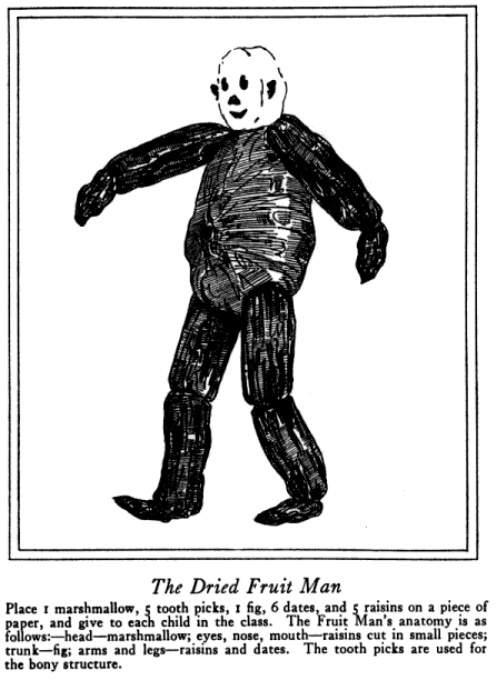 anatomy is as follows:--head--marshmallow; eyes, nose, mouth--raisins